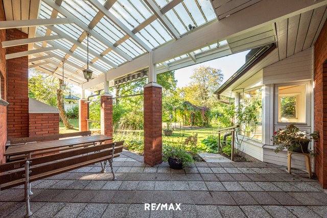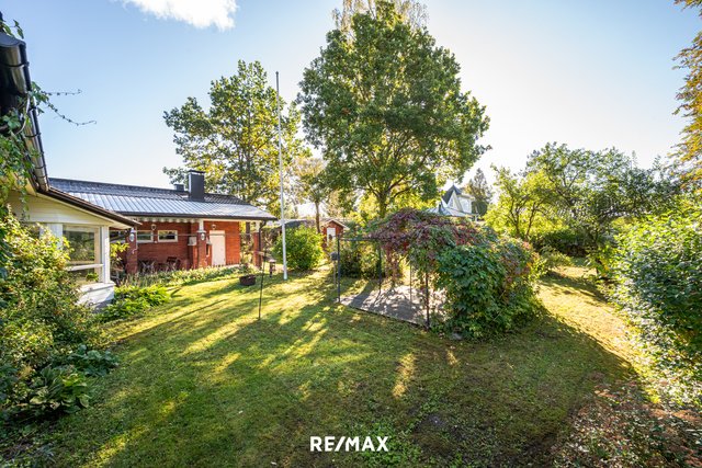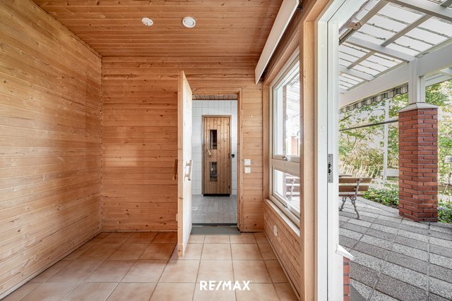- Etupihalla on kivetystä, asfaltoitu pysäköintialue sekä istutuksia ja katettu kuisti. Takapiha on suojaisa. Saunaosastolta sekä keittiön ja ruokatilan puolelta on kulku takapihan idylliselle katetulle terassille. Terassilla on avotakka, jossa voi grillata herkkuja. Villiviiniköynnös kasvaa kauniisti takapihan pergolassa. Pihalla on niin nurmikkoa kuin istutuksia. Naapurit ovat sopivan etäisyyden päässä. Takapiha on hyvin suojaisa. Ruokailutilan jatkeena on viherhuone, josta voi ihailla kesällä kukkaloistoa ja talvella lumisia maisemia myös säältä suojassa.