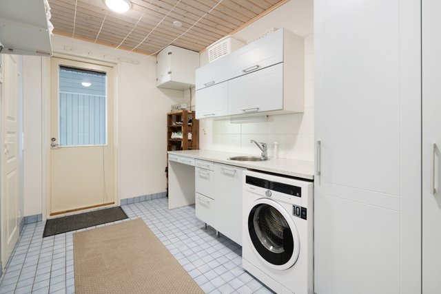 - Pesukoneliitäntä, lattialämmitys, pesuallas, pöytätaso, ja pyykkikaapit