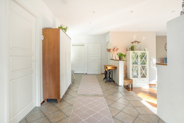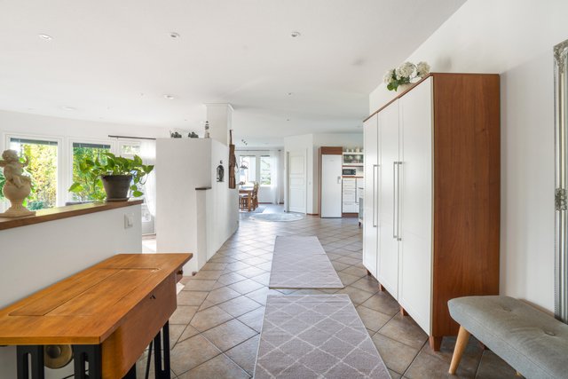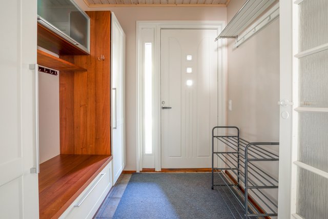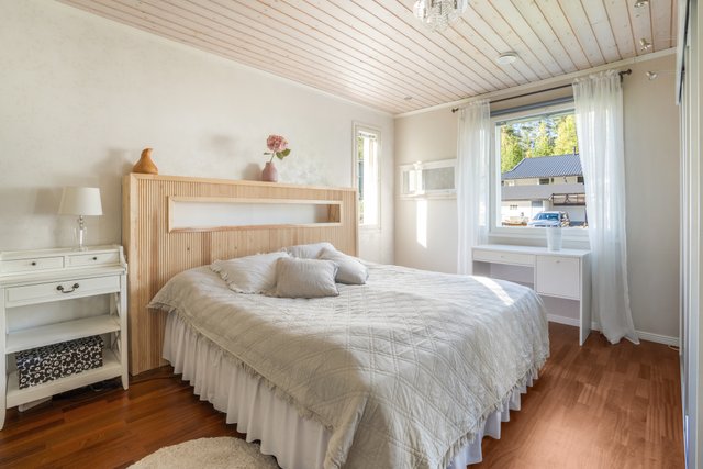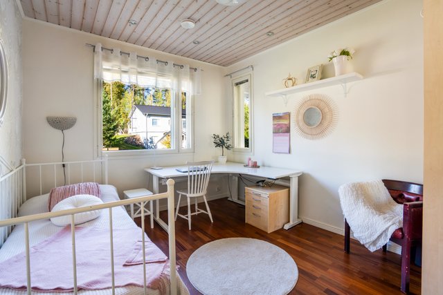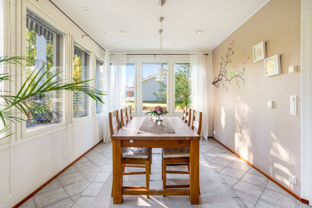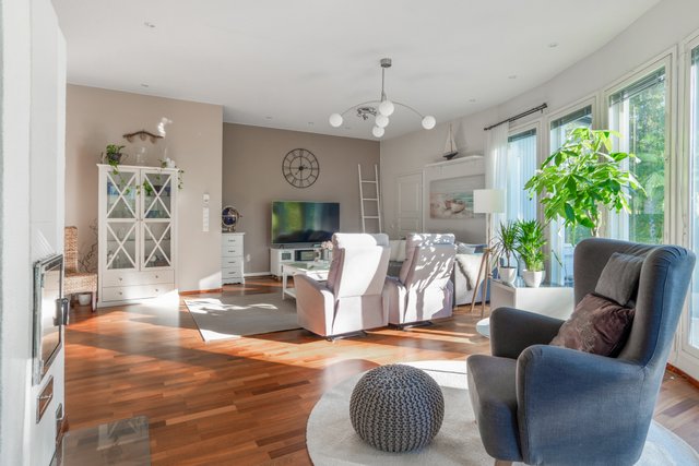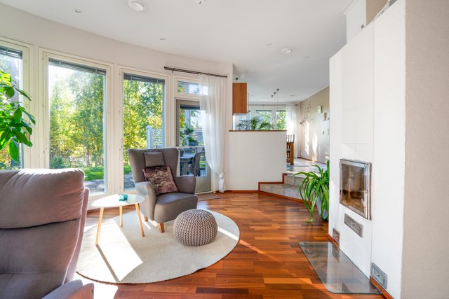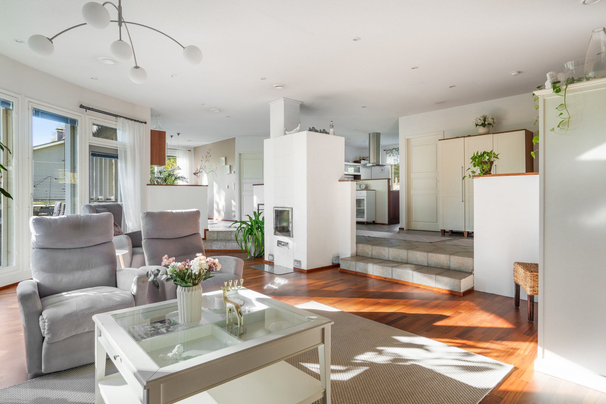 Talo on tilava ja sopii mainiosti isommallekin perheelle. Olohuoneen suuret ikkunat tuovat runsaasti luonnonvaloa sisään ja luovat avaran, lämpimän tunnelman. Hauska eritasoratkaisu olohuoneessa lisää tilan persoonallisuutta ja antaa mahdollisuuksia sisustamiseen.