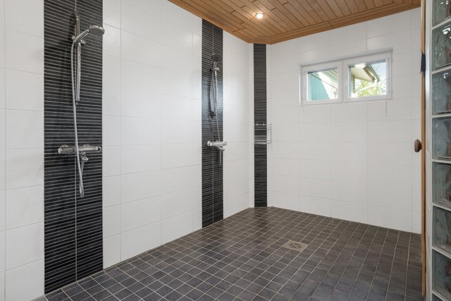 - Tilava kylpyhuone, jossa kaksi suihkua