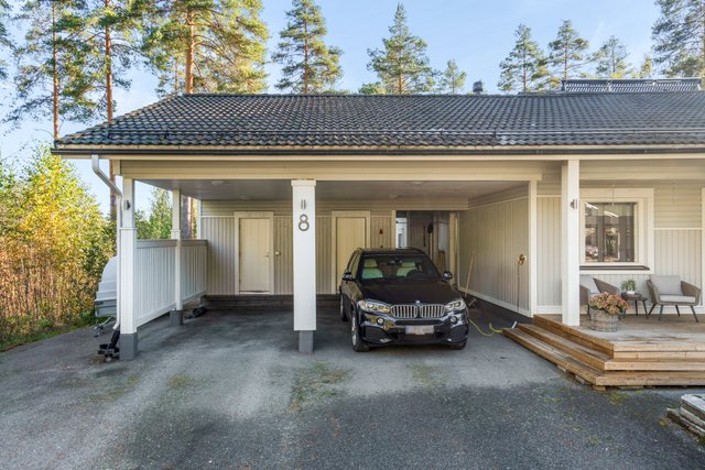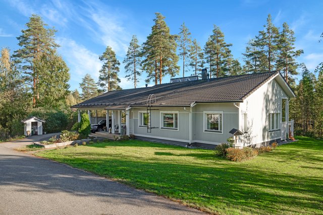 Pihapiirissä on kahden auton tilava katos sekä lämpimät varastotilat. Lämmityksestä huolehtii energiatehokas vesi-ilmalämpöpumppu (VILP) ja varaava takka/leivinuuni, jotka tuovat sekä säästöä että viihtyisyyttä.