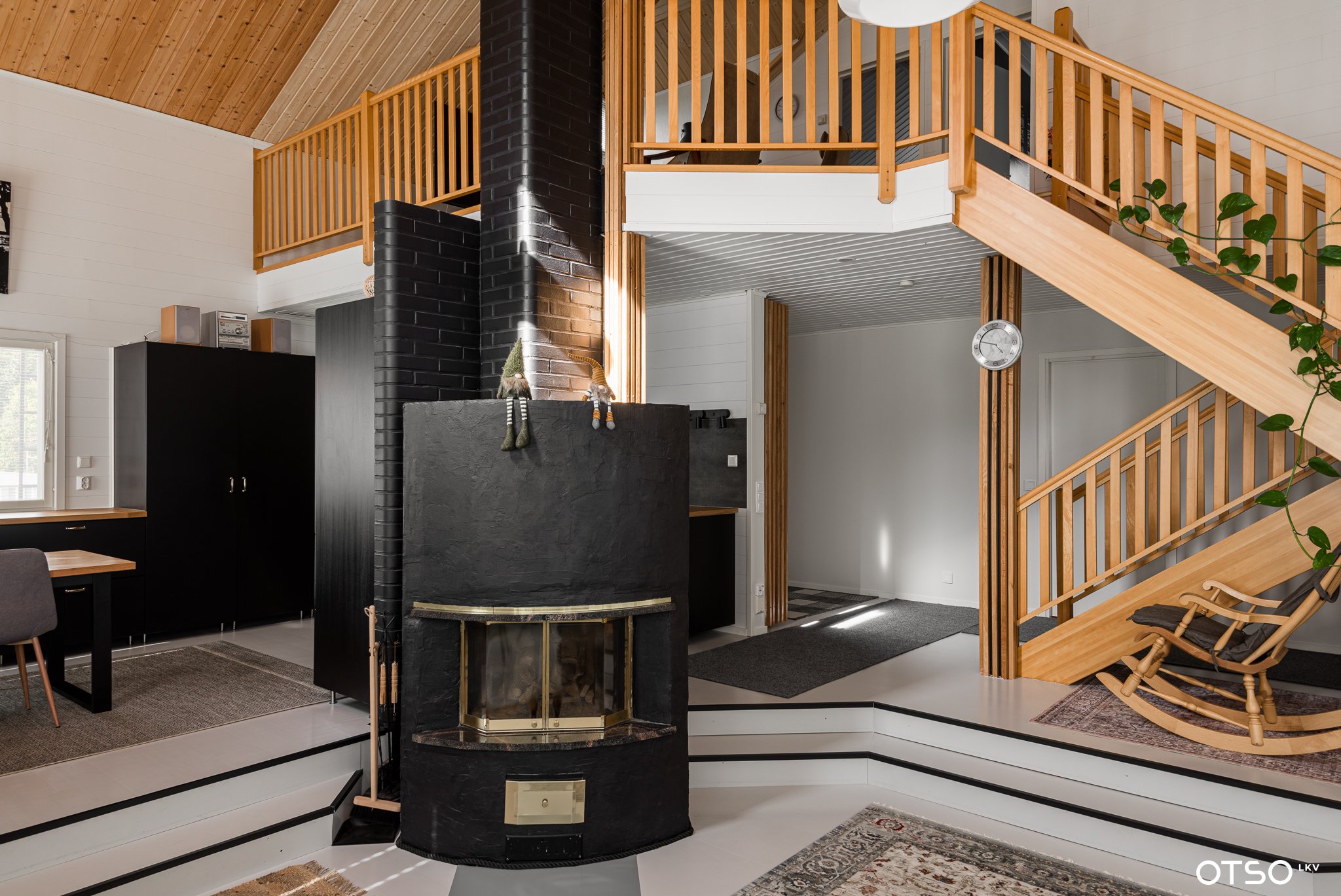 Erinomaiset tilat perheelle kahdessa kerroksessa. Upea musta keittiö avautuu olohuoneeseen luoden kutsuvan tilan ja isot ikkunat tuovat valoa tilaan. Kivana yksityiskohtana porrastetusti olohuone pari porrasta alempana. Takka luo lämpöä keskeiseltä paikalta koko kotiin.