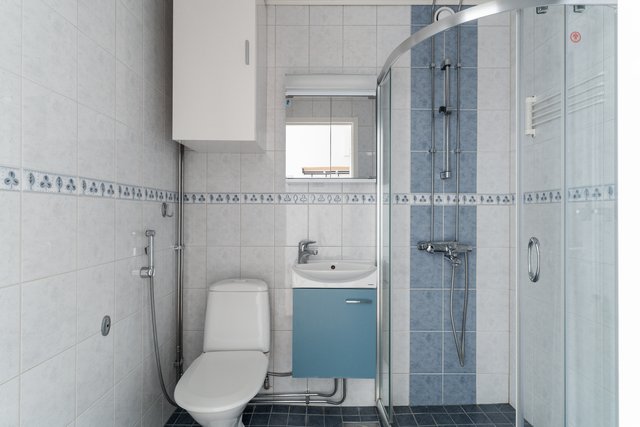 - WC-istuin, suihku, suihkuseinä, pesukoneliitäntä, lattialämmitys, peilikaappi, pesuallas, allaskaappi, ja bidee-suihku
