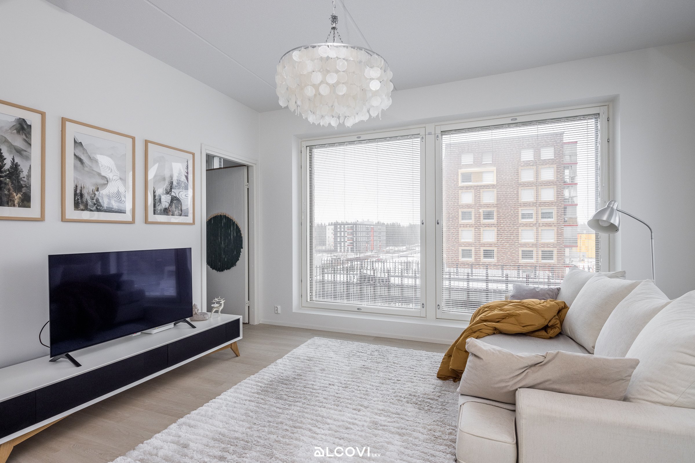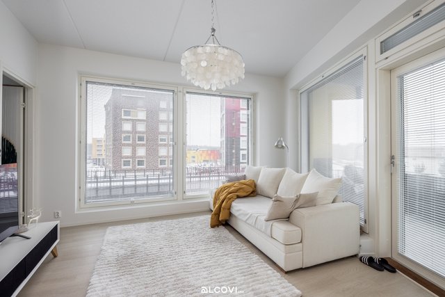 - Olohuoneen lattia on parkettia, seinät maalatut. Kulku parvekkeelle. Vesikiertoinen lattialämmitys.