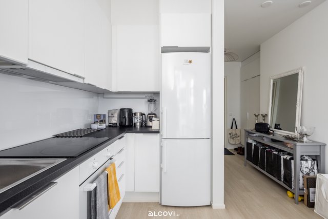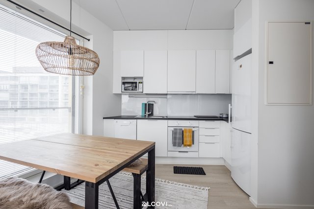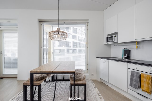 - Avokeittiön varustukseen kuuluu kalusteuuni, liesitaso (kapea), liesituuletin, jääkaappi-pakastin, astianpesukone (45 cm) ja tilavaraus mikroaaltouunille. Työtaso on laminaattia. Lattia on parkettia, seinät maalatut. Vesikiertoinen lattialämmitys.