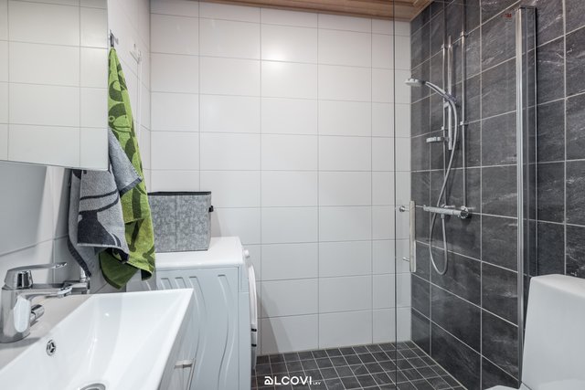 - Kylpyhuoneen varustukseen kuuluu allaskaappi, valaistu peilikaappi, suihku, lasinen suihkuseinä, wc-istuin, bidee-suihku, pyykinpesukoneliitäntä, pyyhekoukut ja vesikiertoinen lattialämmitys. Lattia on laattaa, seinät kaakelia ja katto paneloitu. Kiinteä valaistus.