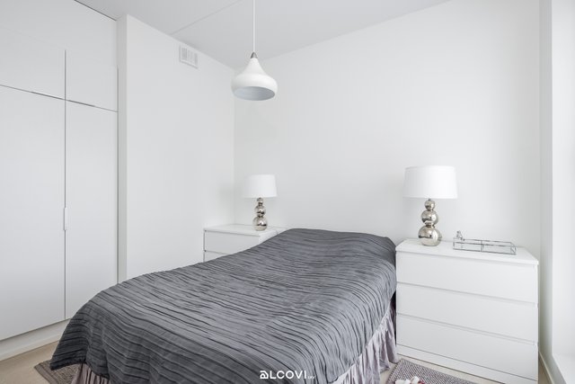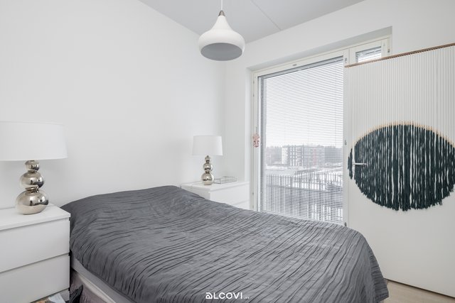 - Makuuhuoneen lattia on parkettia, seinät maalatut. Kiintokaapistoa. Vesikiertoinen lattialämmitys.