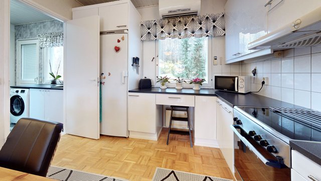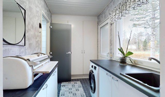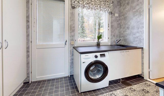 - Pesukoneliitäntä, lattialämmitys, pesuallas, pyykkikaapit, keskuspölynimuri, pöytätaso, ja lattiakaivo