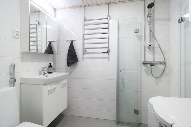 - WC-istuin, suihku, suihkuseinä, pesukoneliitäntä, peilikaappi, pesuallas, allaskaappi, ja bidee-suihku