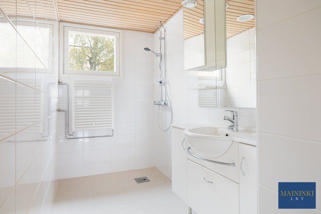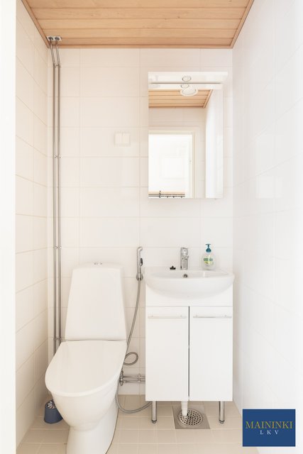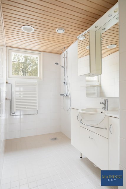 - Suihku, pesukoneliitäntä, peilikaappi, pesuallas, allaskaappi, ja pyyhekuivain