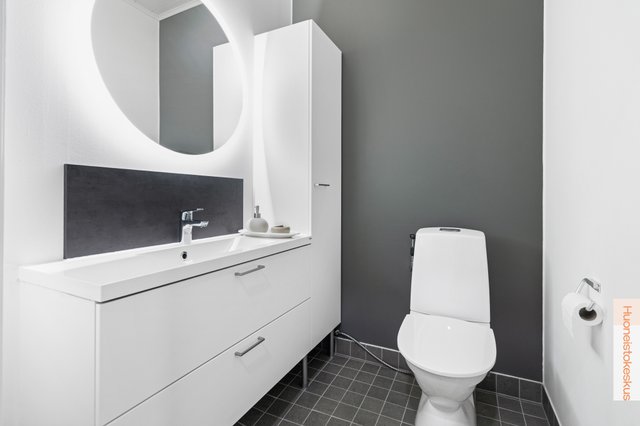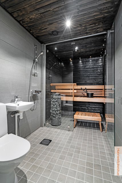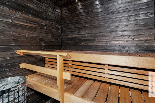 Kylpyhuoneen upea ja suuri mattapintainen seinälaatta yhdistettynä mustaan kattoon tarjoaa tietynlaista luksusta. Saunassa Harvian suosittu pilarikiuas takaa hyvät löylyt tunnelmallisessa valaistuksessa. Varaston tai olohuoneen kautta pääsy ulos terassille vilvoittelemaan. Autokatoksen päässä oleva varastotila on lämmin ja sitä kautta pääsee suoraan kodinhoitohuoneeseen, joka helpottaa esim. ruokakassien tuomista