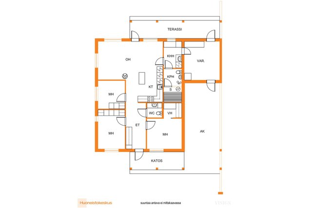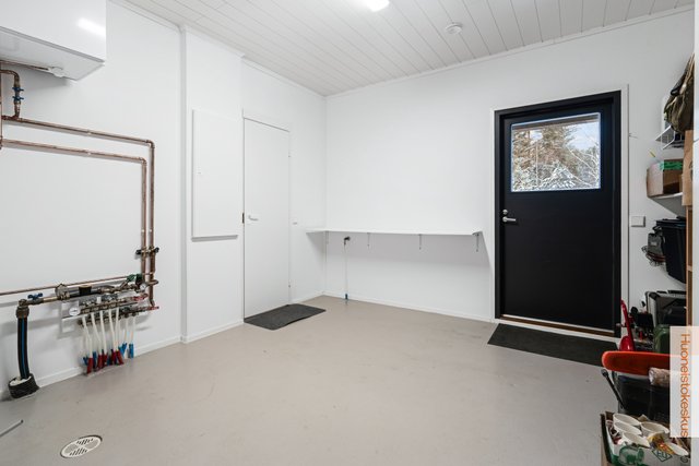 - Vaatehuone ja lämmin varasto talon yhteydessä pääsy kodinhoitohuoneen ja autokatoksen kautta.