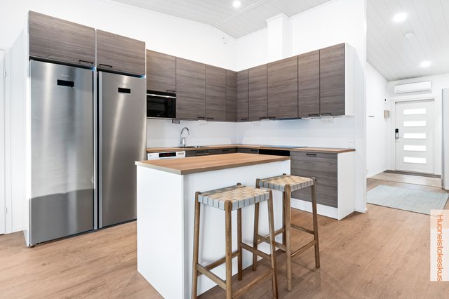 - Jääkaappi, erillinen pakastin, liesituuletin (Käden heilautuksella toimiva, ulos puhaltava hormin kautta), mikroaaltouuni (Integroitu), astianpesukone, keittiösaareke, erillisuuni, liesi, ja led-valot välitilassa