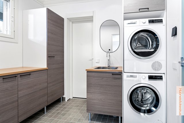 - Pesukoneliitäntä, lattialämmitys, pesuallas, lattiakaivo, pyykkikaapit, pöytätaso, ja tila pesutornille