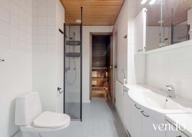 - WC-istuin, suihkuseinä, suihku, peilikaappi, bidee-suihku, allaskaappi, ja lattialämmitys
