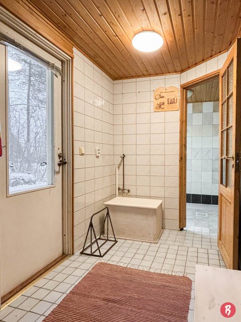 - Yhteisten saunatilojen pukuhuoneesta kulku takapihalle. Pääovella yhteinen eteistila