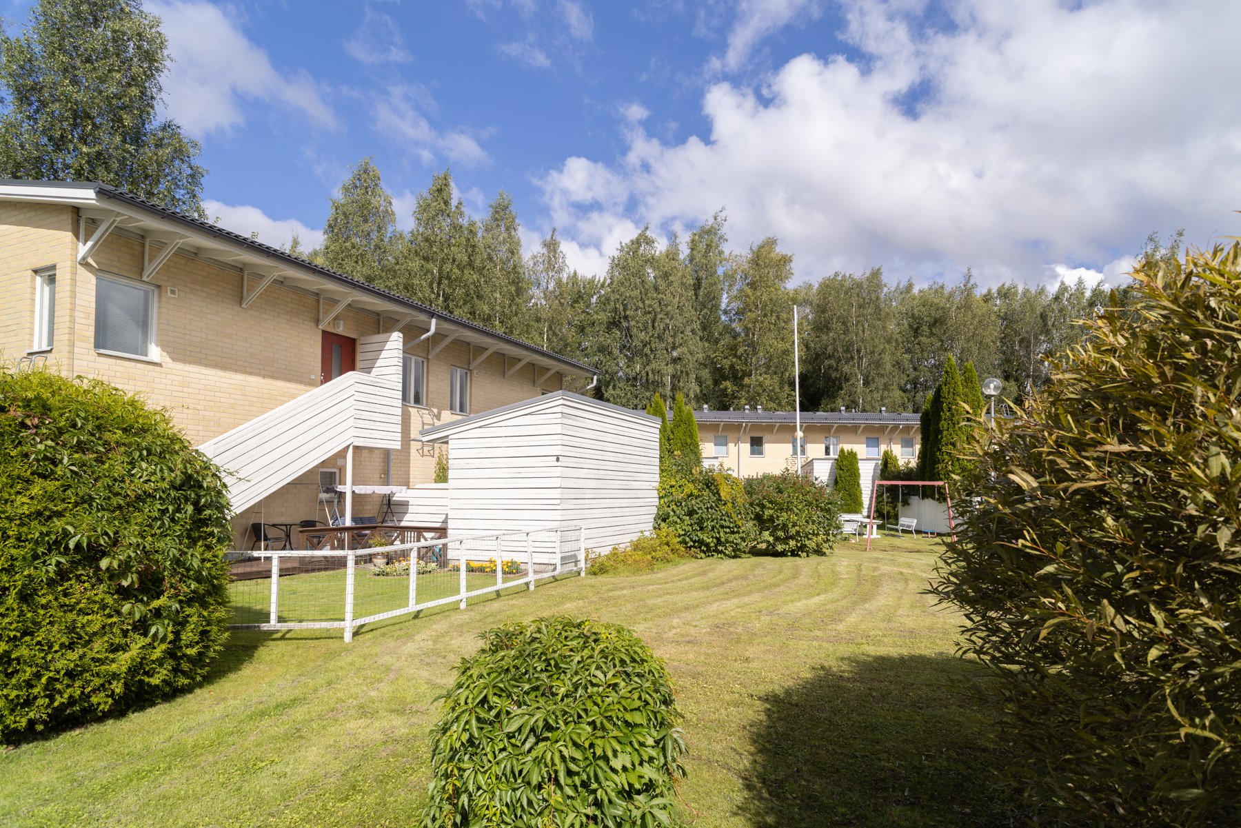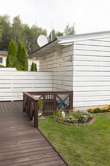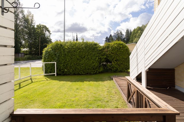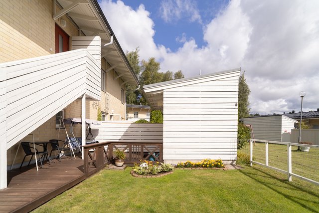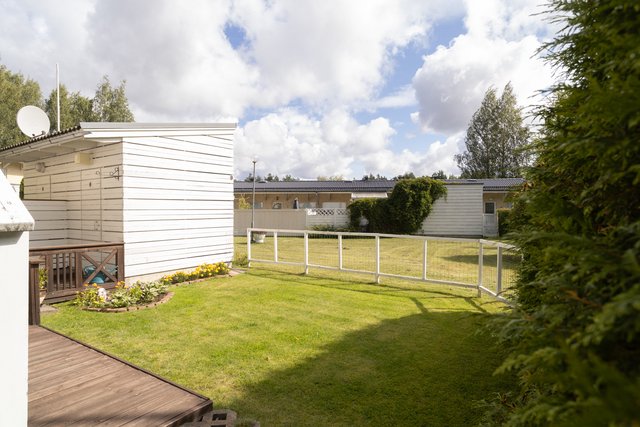 Aidatulta pihalta löytyy viihtyisä, suojaisa terassi. Tuija-aita rajaa näkymiä, nurmikko ja istutukset viimeistelevät pihan. Täällä juot kahvit, grillaat ja annat lasten leikkiä huoletta.