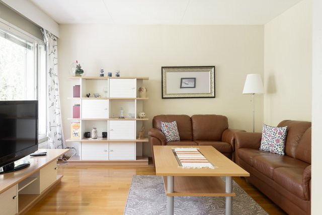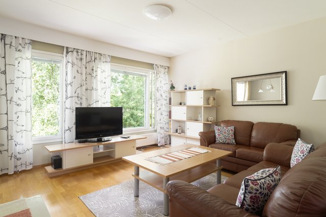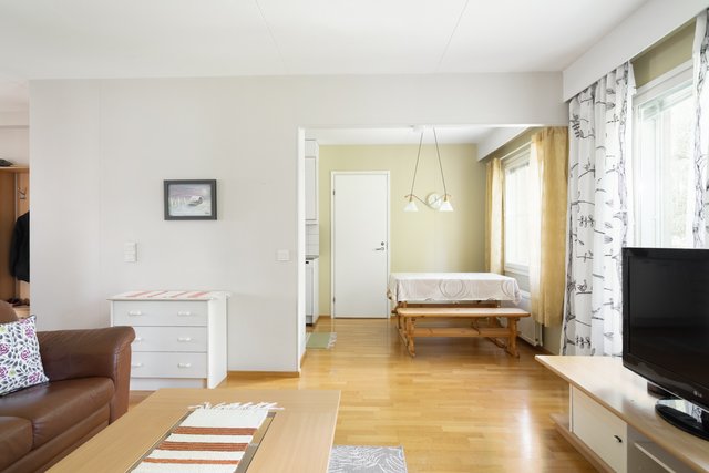 Keittiö yhdistyy sulavasti oleskelutilaan, jättäen sopivan tilan ruokailuryhmälle. Olohuoneen suuret ikkunat päästävät runsaasti valoa sisään ja lisäävät tilan ja avaruuden tuntua. Asunnossa on kaksi fiksun kokoista ja hyvin sijoitettua makuuhuonetta.