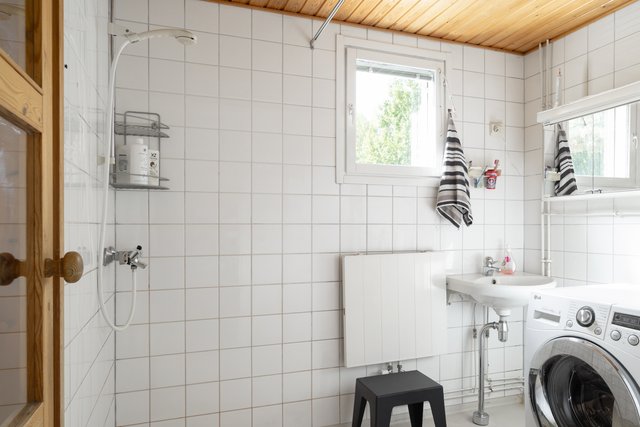 Kylpyhuoneeseen saa mahdutettua oman pyykkihuollon ja omassa saunassa nautit lempeistä löylyistä. Arkea helpottamaan löytyy myös erillinen wc.