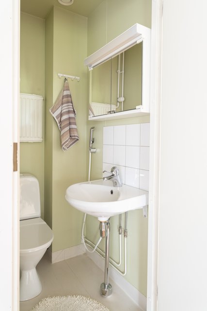 - Pesukoneliitäntä, suihku, peilikaappi, pesuallas, ja patteri
