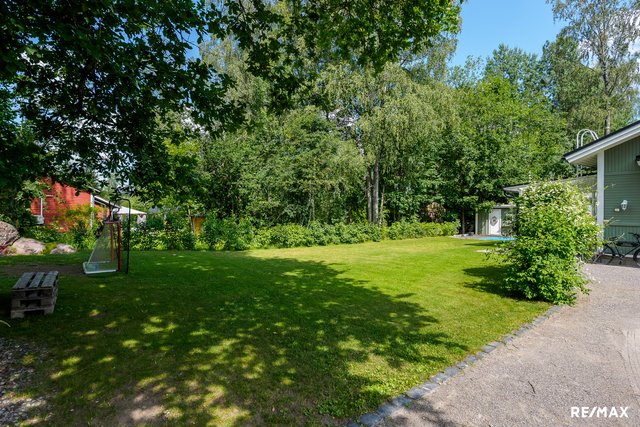 Reilunkokoinen ja tasainen piha-alue on oikein sopiva pallopeleihin ja ulkoporeammeelle on hyvin tilaa. Kaksi varastoa tuovat kaivattua säilytystilaa. Pensasaidalla rajattu piha-alue on selkeä ja etupihan parkkialueelle mahtuu useampi auto.