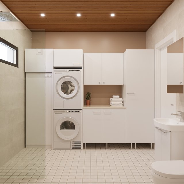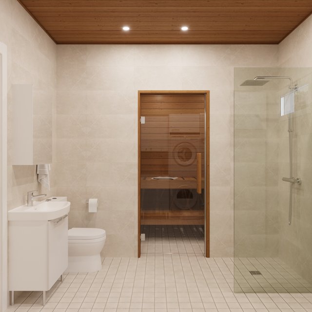 - Suihku, wc-istuin, peili, lattialämmitys, pesukoneliitäntä, suihkuseinä, allaskaappi, ja kiinteät valaisimet