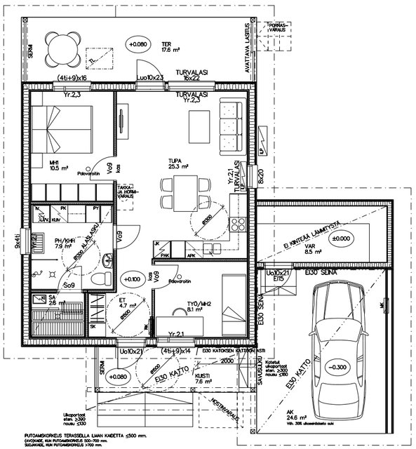 - Eteinen, kylpyhuone ja sauna laatta. Muissa tiloissa vinyylilankku.