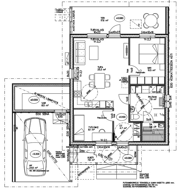 - Huoneistoala 61,5m², varasto 8,5m². Kokonais kerrosala autokatoksen kanssa 107m².