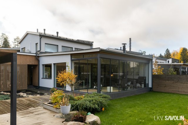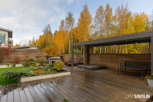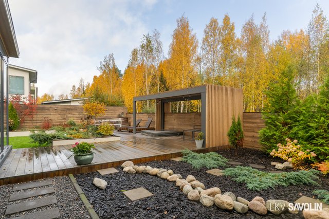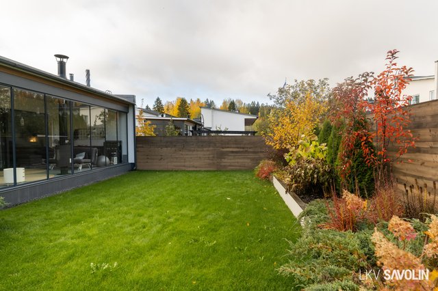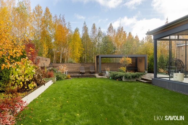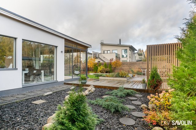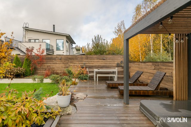 Kodin ehdoton helmi on huolella toteutettu takapiha sekä lasitettu terassi – oma rauhallinen keidas, jossa voi nauttia niin arjesta kuin juhlastakin. Viimeistelty pihasuunnittelu täydentää kokonaisuuden ja tekee tästä kodista todellisen elämyksen.