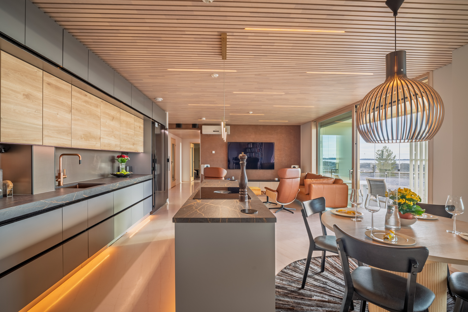 - Kosteissa tiloissa Radiata mäntypaneeli, muissa tiloissa mäntyrimakatto upotetulla led valaistuksella.
