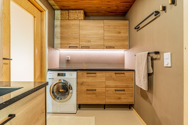 - Lattialämmitys, pesukone, pyykkikaapit, lattiakaivo, ja pöytätaso