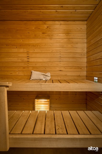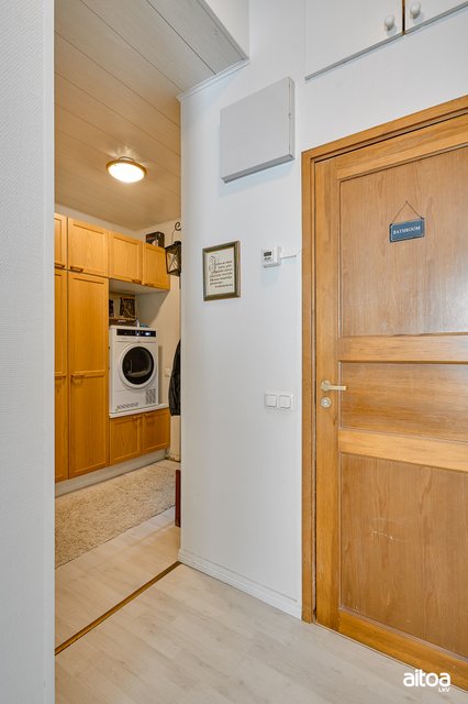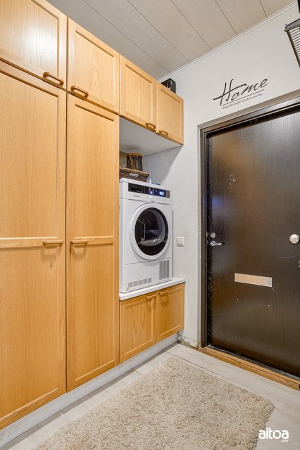 - Eteisen kaapisto, säilytystila kylpyhuoneen ja saunan päällä, ullakko/kellarikomero.
