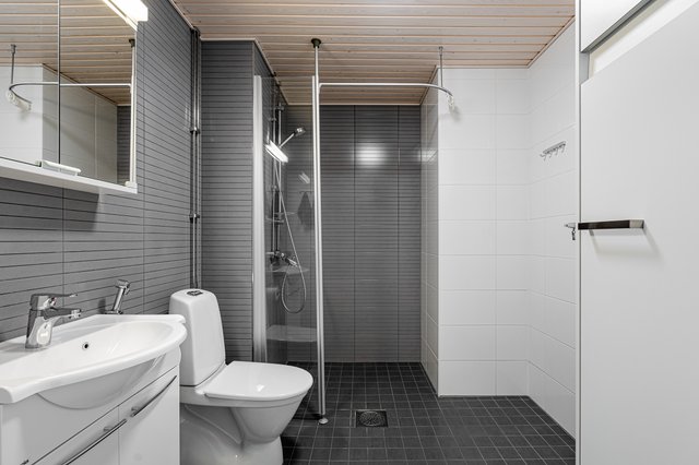 - WC-istuin, suihku, lattialämmitys, bidee-suihku, allaskaappi, pesuallas, peilikaappi, ja suihkuseinä