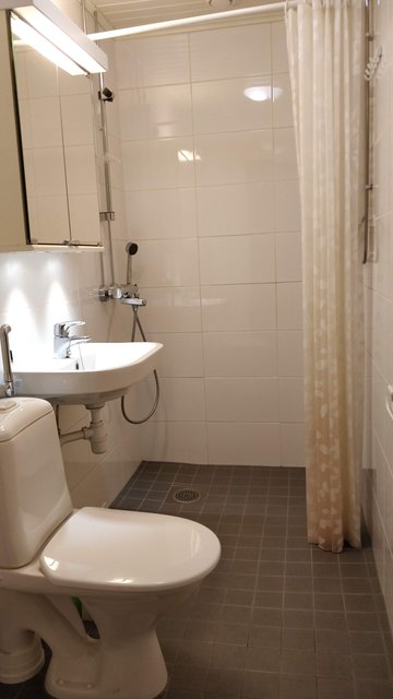 - WC-istuin, suihku, pesukoneliitäntä, peilikaappi, pesuallas, ja bidee-suihku