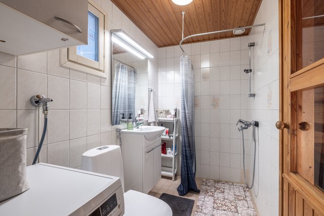 - Pesuhuoneessa pesukoneliitäntä, yläkaappi, wc-istuin, bideesuihku, pesuallaskaappi, peili, suihkuverho, suihku. Ikkuna. Pesuhuoneen uudet kaakelit ja laatat on ostettu, ja ne siirtyy uudelle omistajalle kaupanteossa.