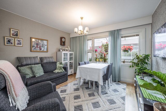 Asunnon olohuoneesta avautuu näkymä Rengonraitille, ja tilava lasitettu parveke toimii lisähuoneena keväästä pitkälle syksyyn.