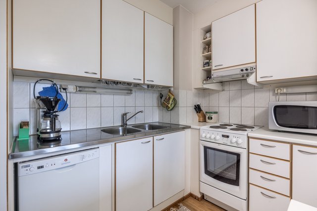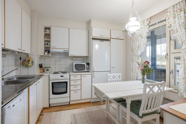 - Valoisa, vaalea keittiö, ruokapöydälle hyvä tila. Kodinkoneina sähköliesi, liesituuletin, astianpesukone ja jääkaappi/pakastin. Kolmella seinustalla työtasoa, säilytystilana korkeat kaapit, kaapistot ja laatikostot. Välitila laatoitettu.