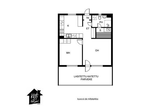 Oh, keittiö, makuuhuone, pesuhuone/WC/sauna, eteinen, lasitettu, katettu parveke.