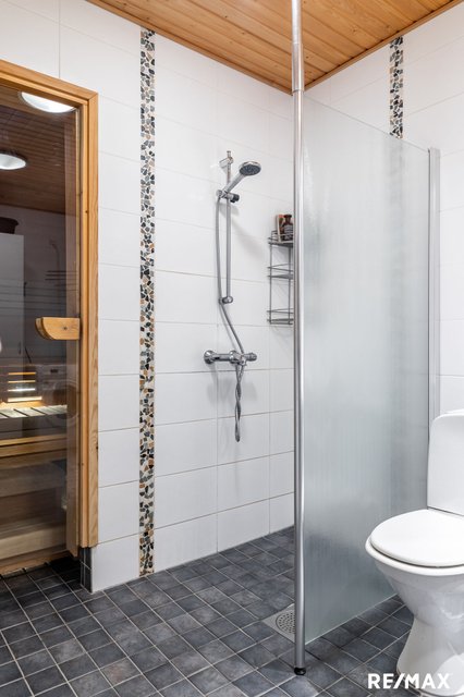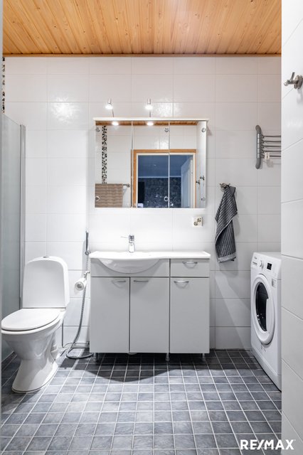 - WC-istuin, suihku, pesukoneliitäntä, peilikaappi, allaskaappi, ja bidee-suihku