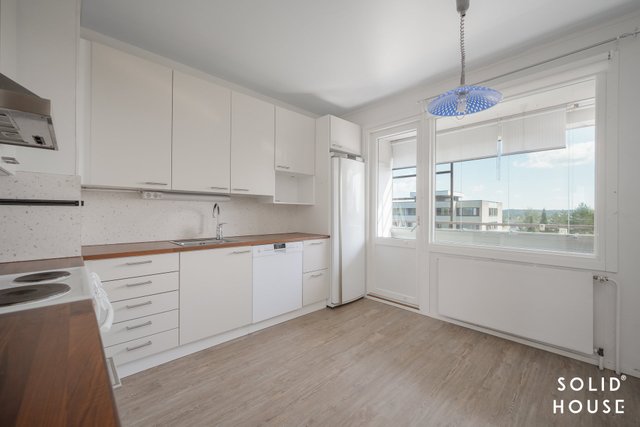 - Kaapistot, astianpesukone, liesi, jää-viileäkaappi, liesituuletin 8suodatin), kiinteät valaisimet. Lattia korkkia, seinät tapettia, välitila laminaattia, työtasot laminaattia.