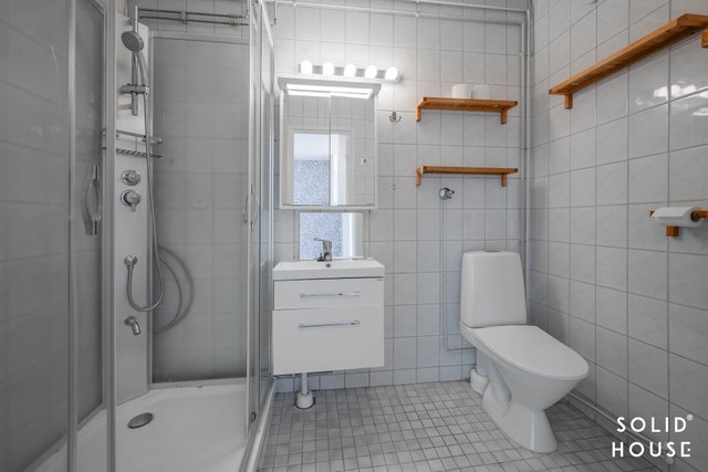 - Suihku, suihkukaappi, wc-istuin, bidee, allaskaappi + allas, peilikaappi, pesukoneliitäntä. Lattia ja seinät laattaa.