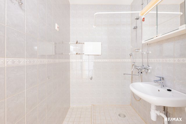 - Kylpyhuoneessa suihku, pesukoneliitäntä, käsienpesuallas, wc-istuin, peilikaappi ja seinäpatteri.