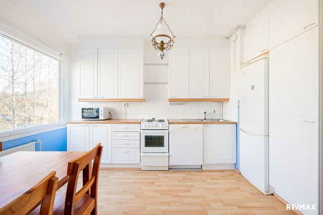 - Keittiössä kaapistot, sähköliesi, astianpesukone ja jääkaappipakastin. Keittiö remontoitu 2000 luvun alussa.