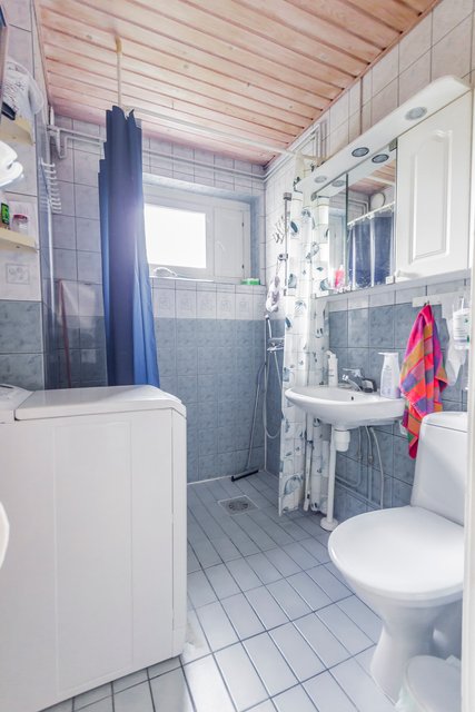 - WC-istuin, suihku, pesuallas, peilikaappi, ja pesukoneliitäntä