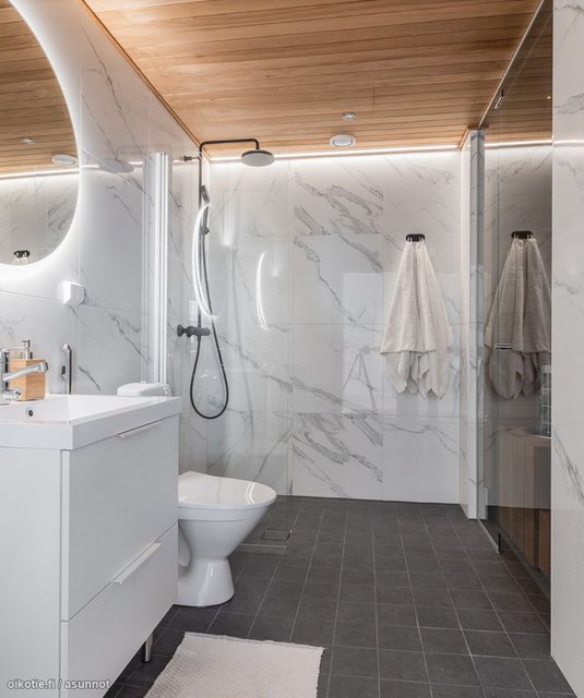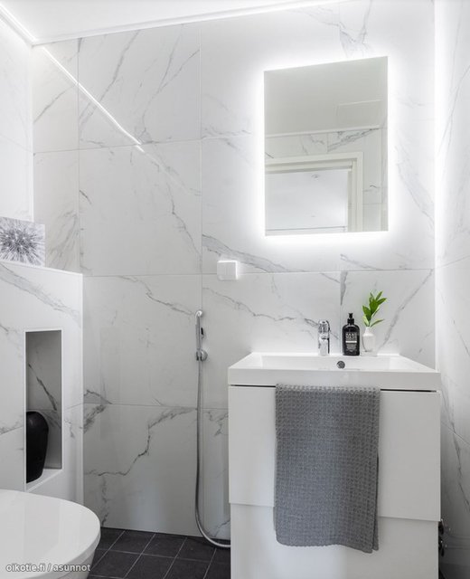 - WC-istuin, suihku, suihkuseinä, pesukoneliitäntä, lattialämmitys, peili, allaskaappi, ja bidee-suihku