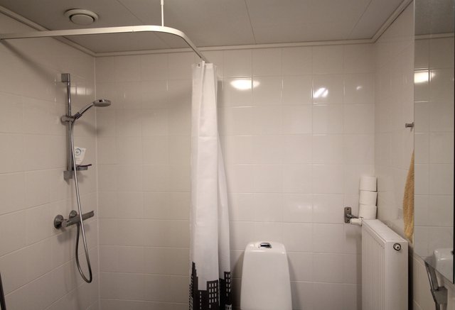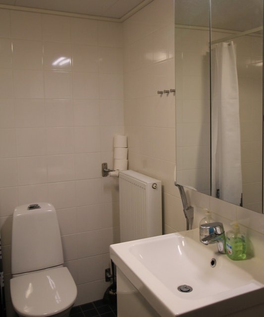 - WC-istuin, suihku, pesukoneliitäntä, peilikaappi, pesuallas, allaskaappi, ja bidee-suihku