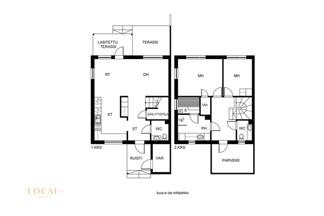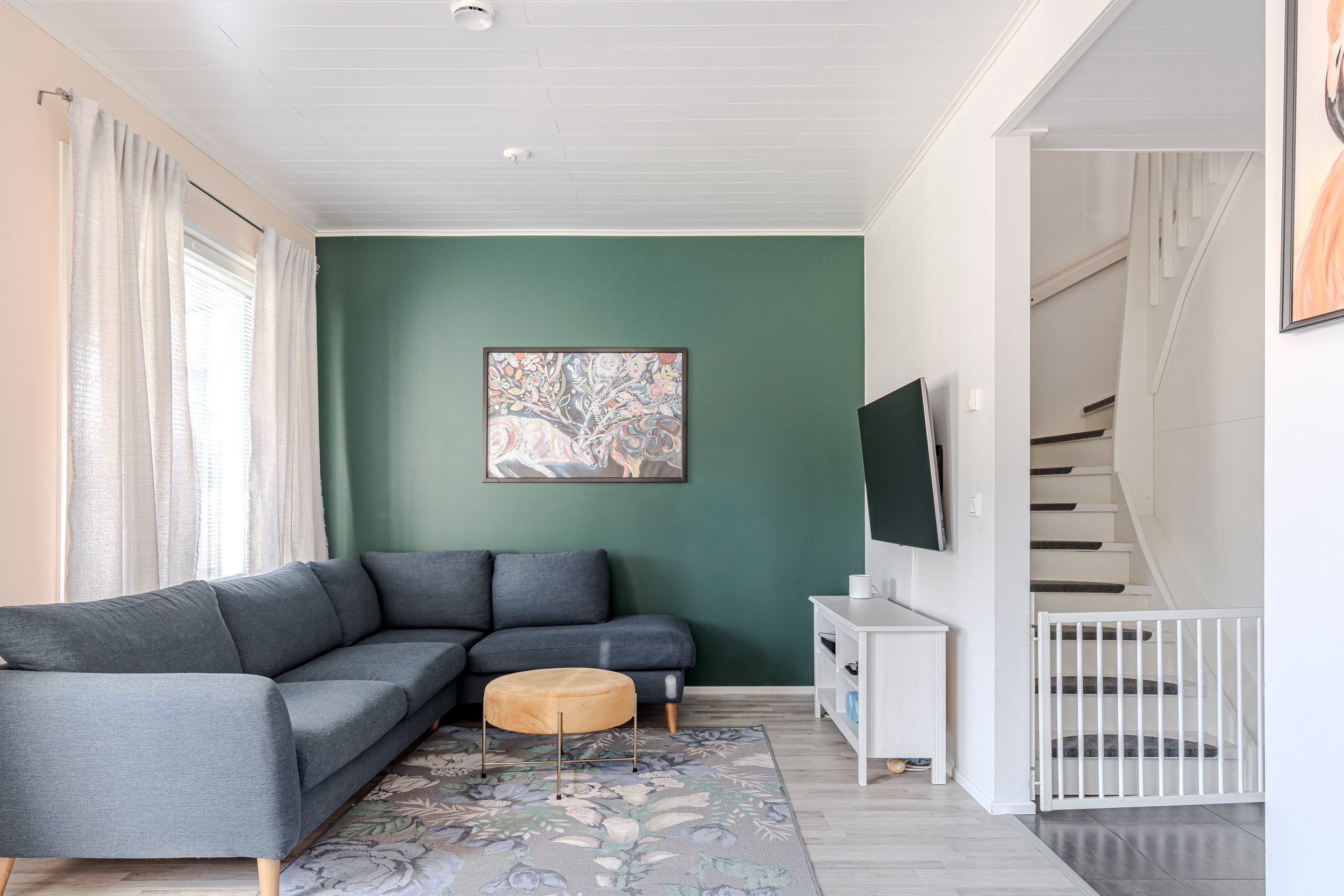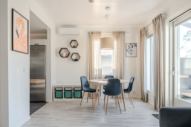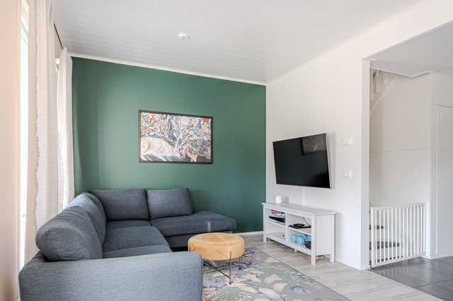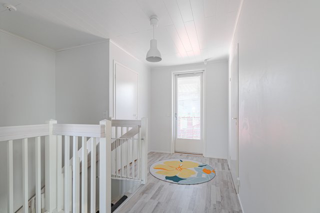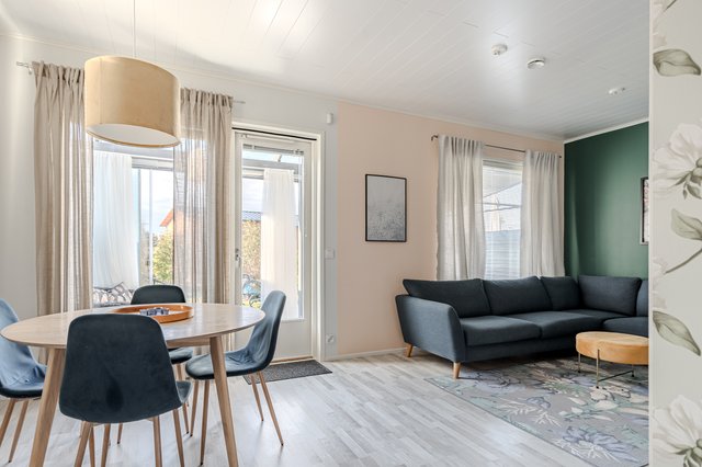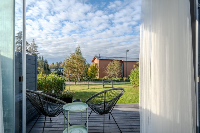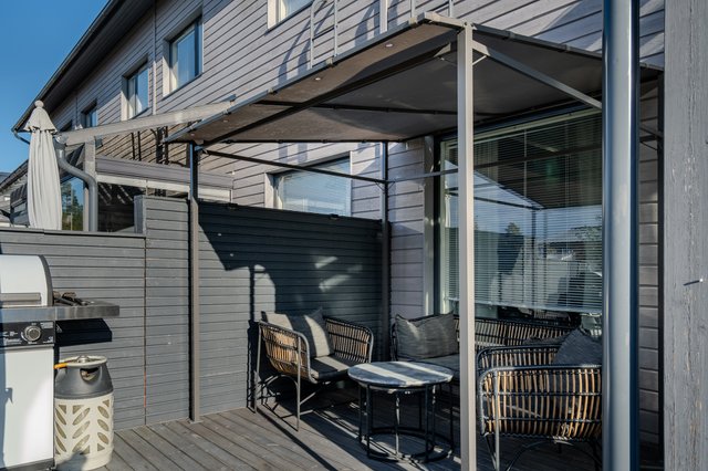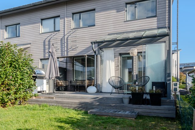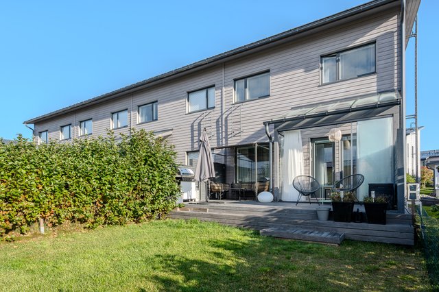 Asunnon piha on ihanteellinen. Terassista osa on lasitettu, jossa voi viettää aikaa pitkälle syksyyn. Terassilta löytyy mahdollisuus grillaukseen ja ajanviettoon ystävien kanssa. Terassin jälkeen piha jatkuu vehreänä, tuoreena nurmikkona. Asunnon keittiöstä löytyy paljon laskutilaa ruoanlaittoon sekä yhteys olohuoneeseen luo oman tunnelmansa illan viettoon. Olohuoneeseen mahtuu suurempikin ruokapöytä. Keittiö ja eteinen on laatoitettu. Kaksi WC:tä ja erillinen kylpyhuone tuovat helppoutta arkeen. Säilytystilaa on paljon. Portaiden alla, makuuhuoneen vaatehuoneessa sekä ulko-oven vieressä ulkovarastossa! Iso kylpyhuone toimii myös kodinhoitohuoneena. Kylpyhuoneessa on sauna, josta pääset suoraan vilvoittelemaan yläkerran parvekkeelle.