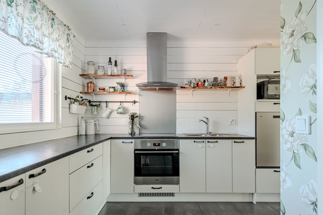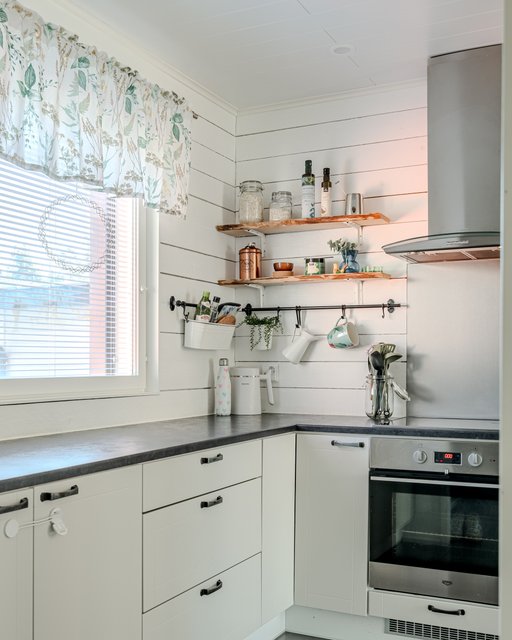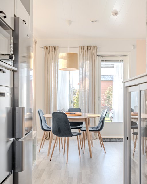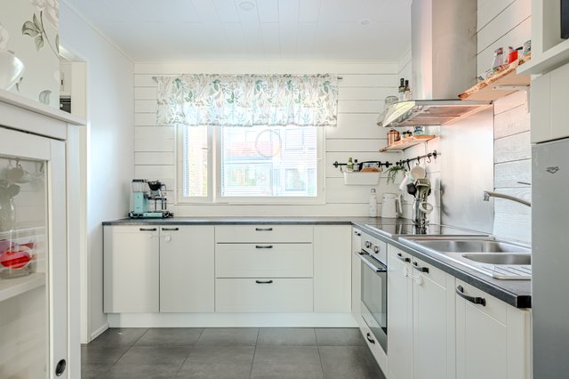 - Jääkaappipakastin, uuni, liesi, liesituuletin, astianpesukone, ja paljon laskutilaa