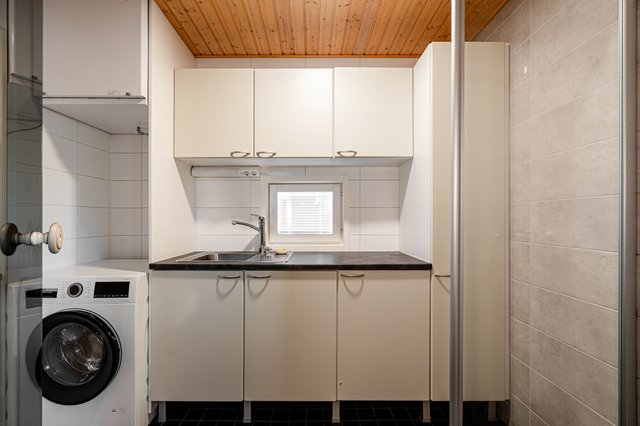 - Pesutila toimii myös kodinhoitohuoneena, jossa kaapistot, laskutilaa ja pyykinpesukone.
