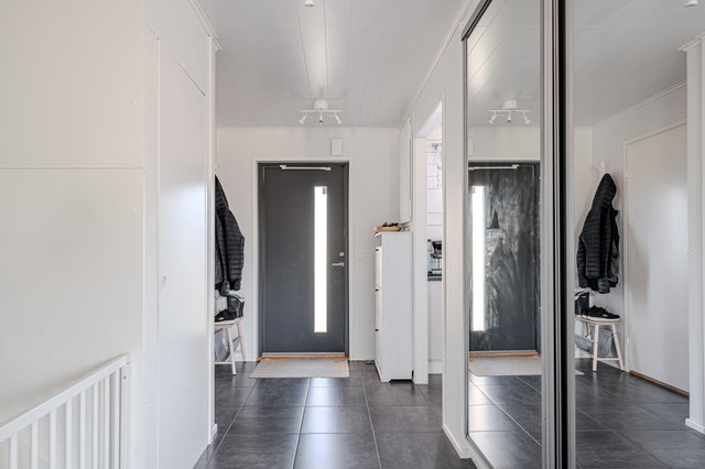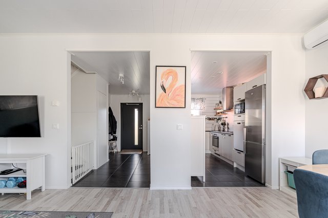 - Eteisessä ja keittiössä on kivilaattalattia.